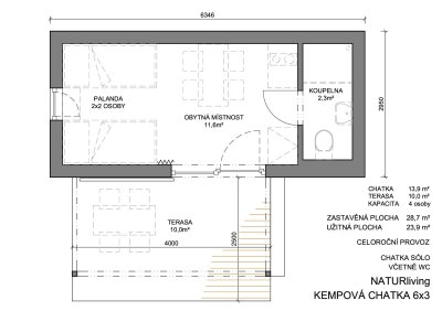 Kempová chata 6×3 m je navrhnutá pre tých, ktorí chcú ponúknuť viac než len prenocovanie. Kompaktná stavba ukrýva plnohodnotné zázemie, vlastnú kúpeľňu s WC a premyslený interiér, v ktorom sa hostia cítia pohodlne hneď po príchode.