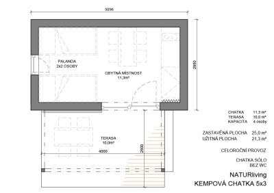 Vďaka absencii vlastnej kúpeľne (variant bez WC) je ideálna do areálov so spoločným sociálnym zariadením – čo výrazne znižuje počiatočné náklady aj nároky na údržbu.