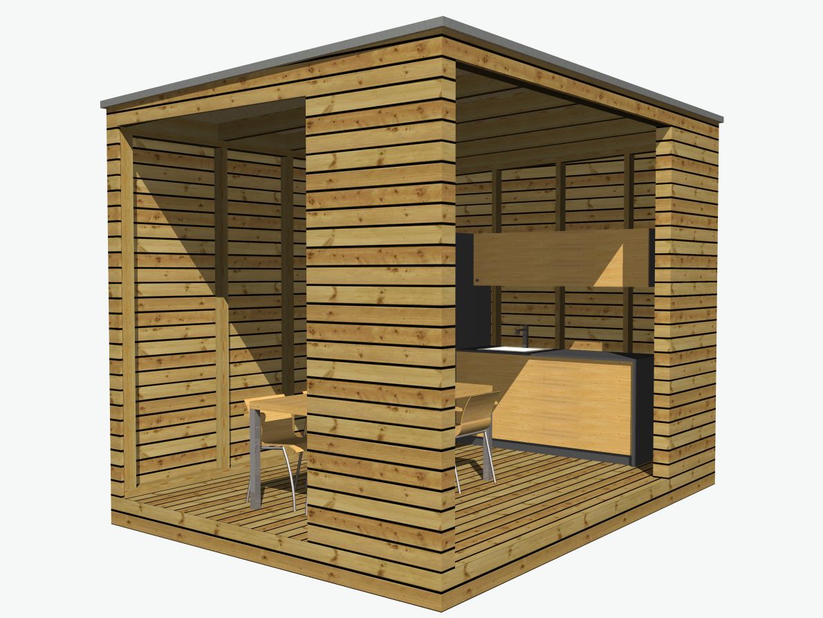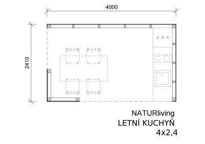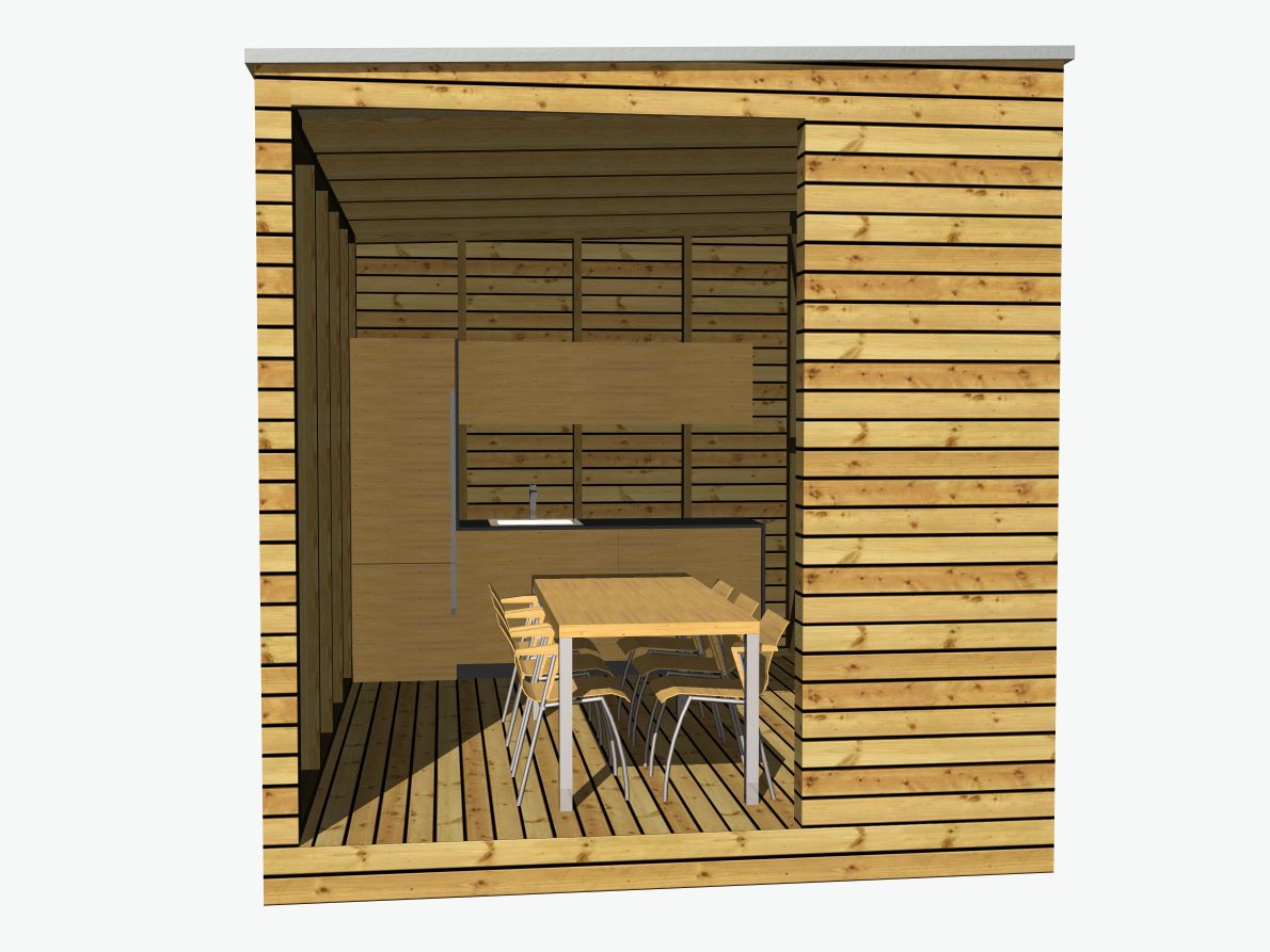 Chystáte letné grilovanie a prekvapila vás náhla prehánka alebo búrka? Vďaka našej letnej kuchyni už nemusíte svoju párty rušiť. Stačí presunúť stôl pod tento krytý prístrešok. Letná kuchyňa má rozmery 4x2.4 ms a ponúka dostatok priestoru pre malú kuchynskú linku, kde môžete uložiť všetky potrebné veci na letné grilovanie, chladničku a kuchynský drez. Navyše nebudete musieť behať sem a tam do domu po každý tanier.