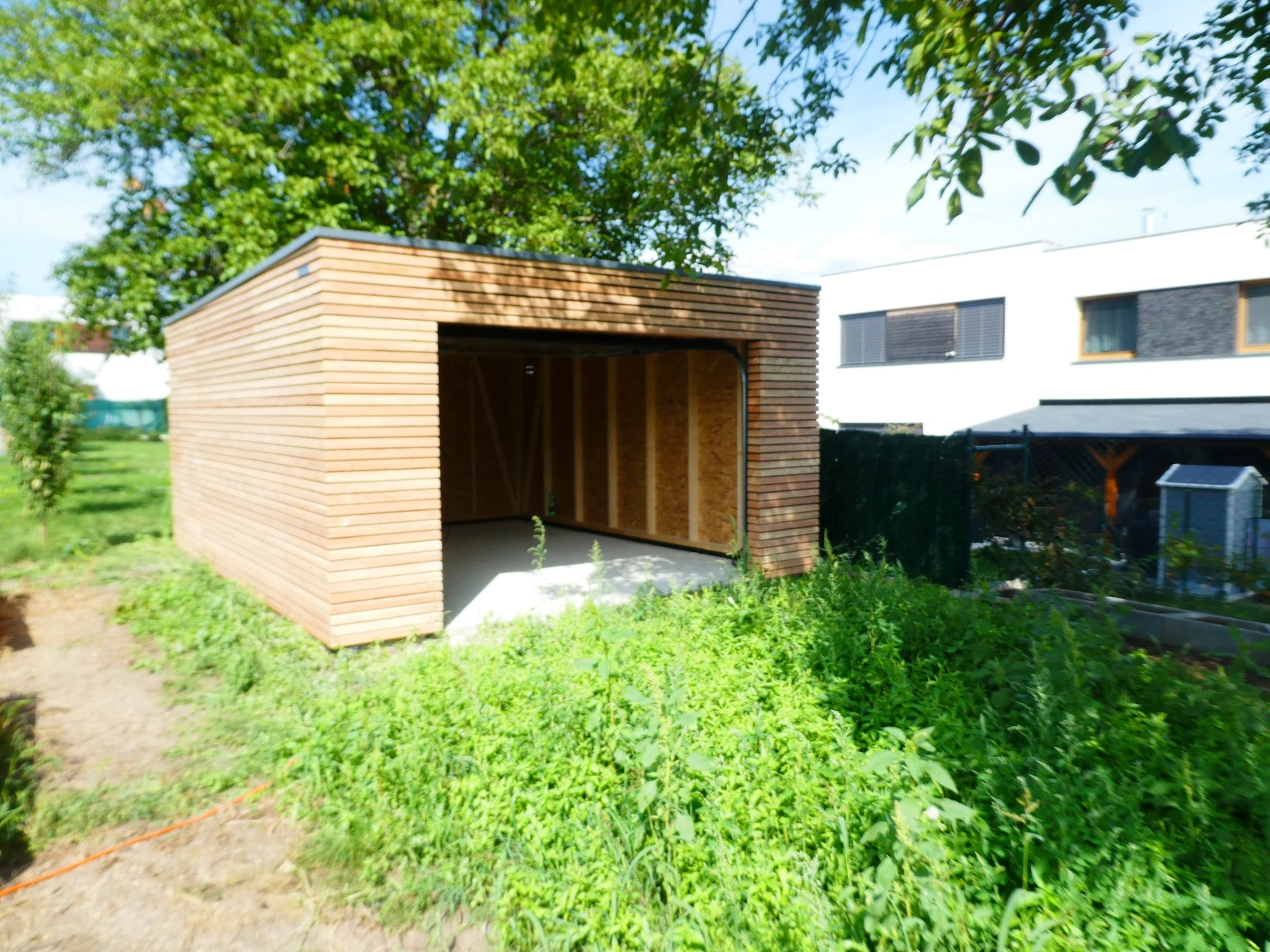 Vznikol praktický a zároveň dizajnový priestor na bezpečné uloženie záhradného traktora a ďalšieho vybavenia. Stavba vniesla do záhrady poriadok, optické zjednotenie a zároveň modernizovala jej celkový vzhľad.