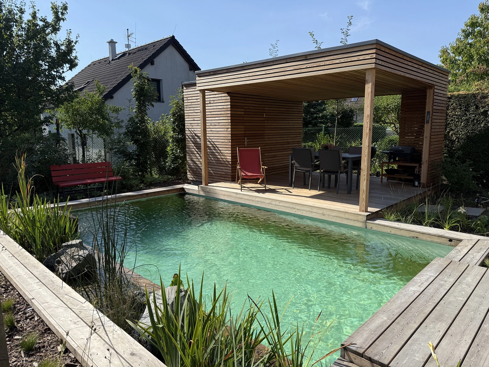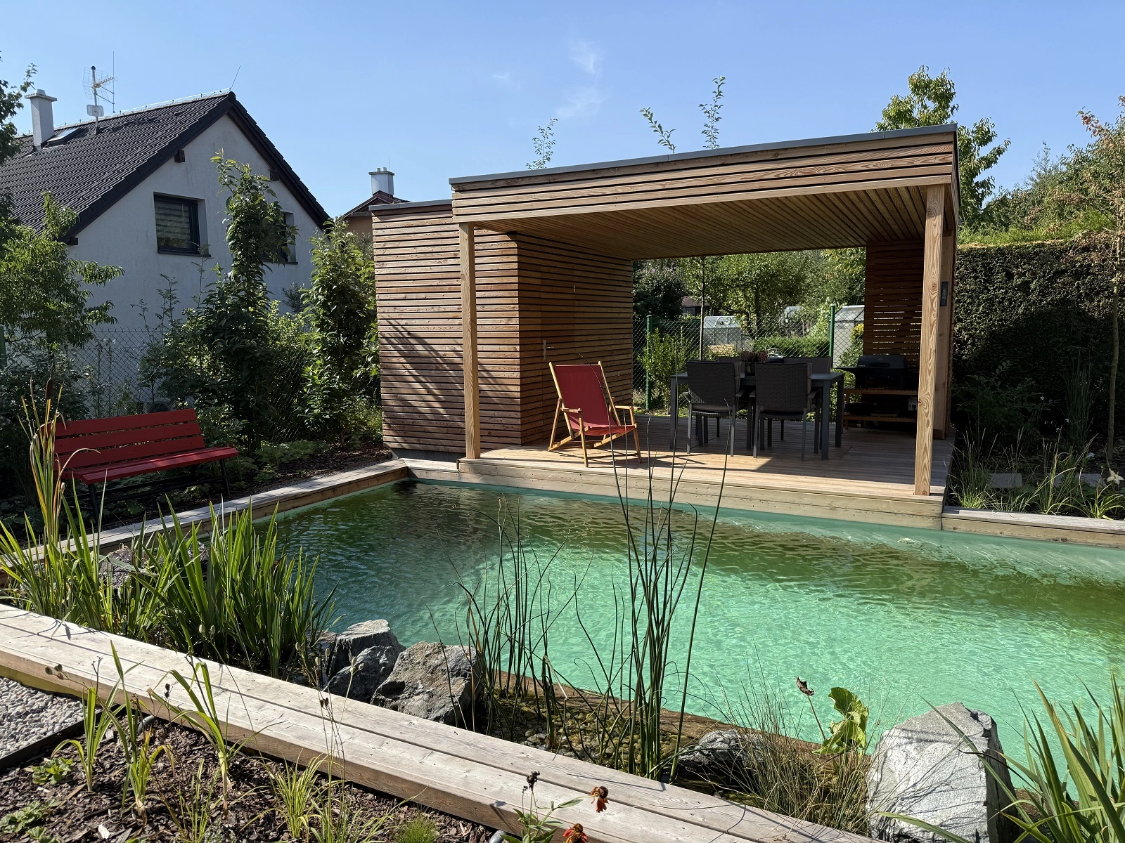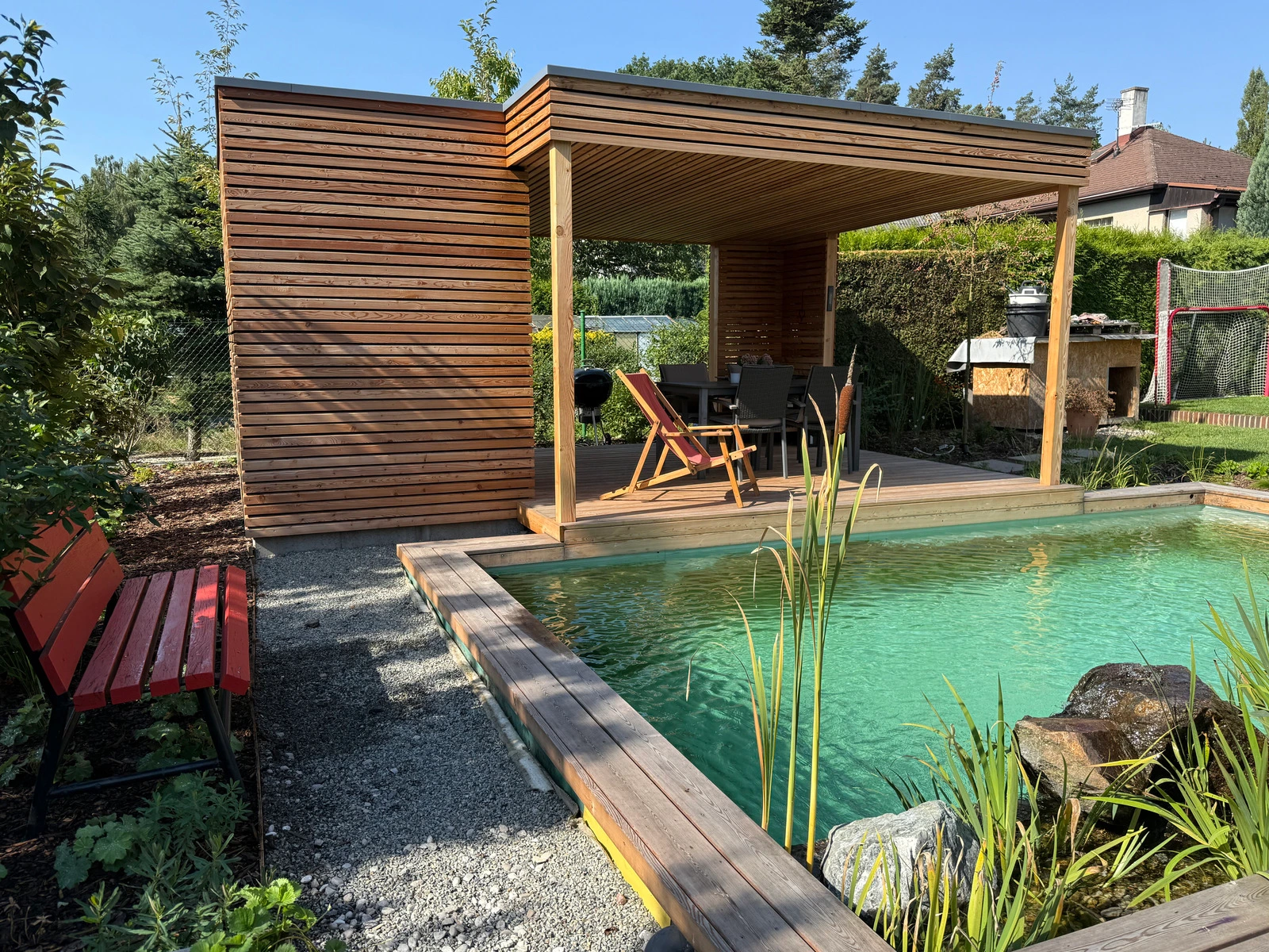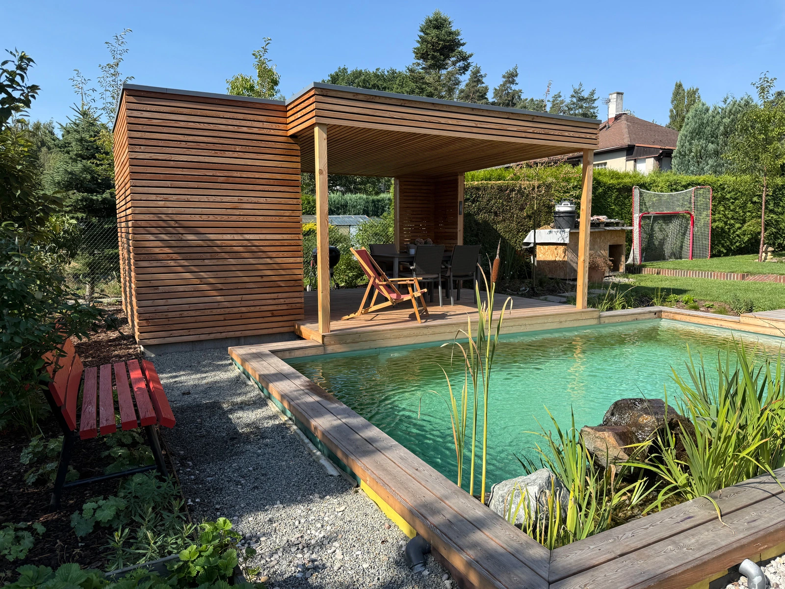 Výsledkom je multifunkčná záhradná stavba, ktorá rozširuje obytný priestor smerom do záhrady. Krytá terasa sa stáva prirodzeným centrom letného života – miestom na posedenie, oddych po kúpaní aj spoločné večery.