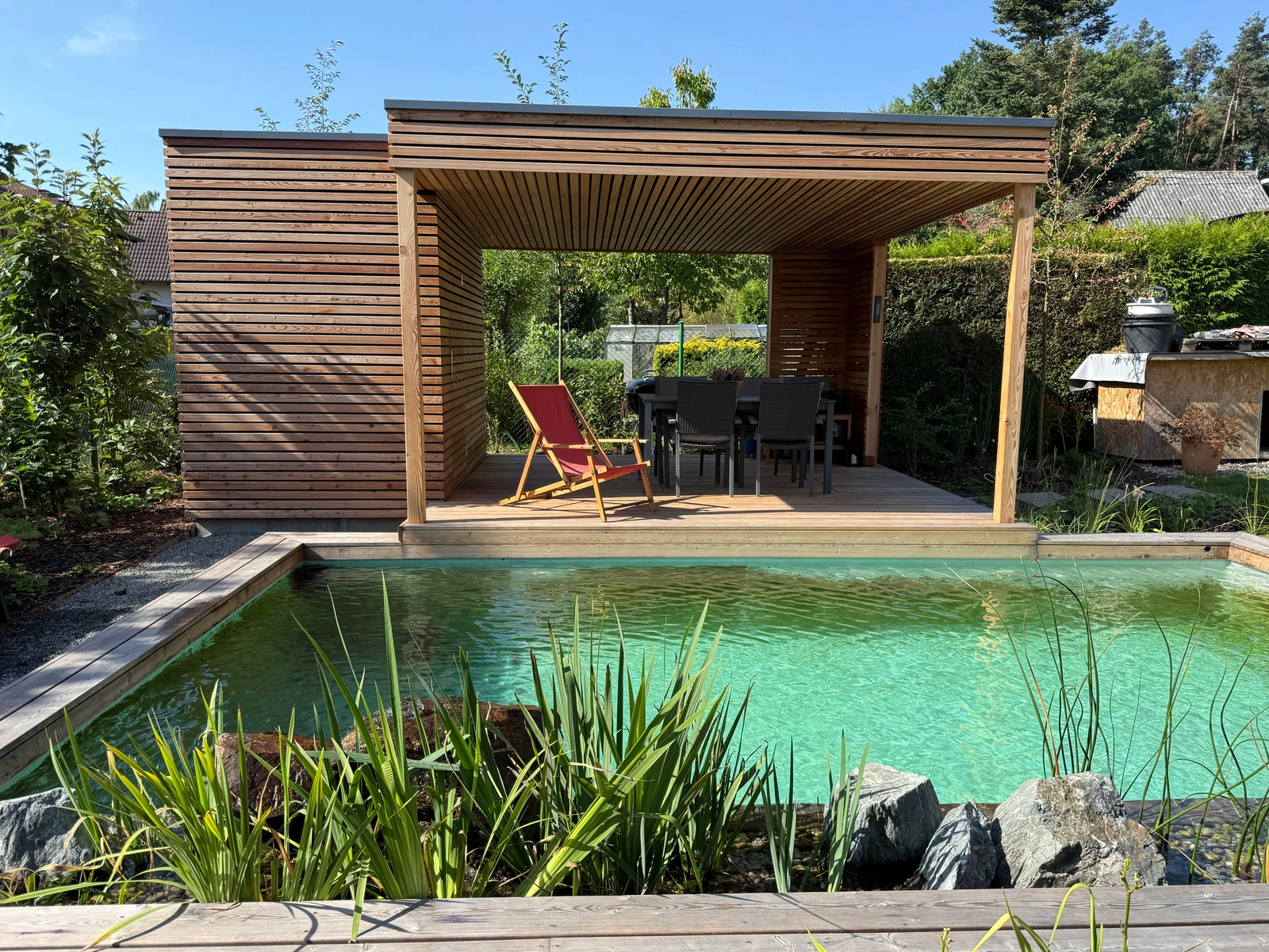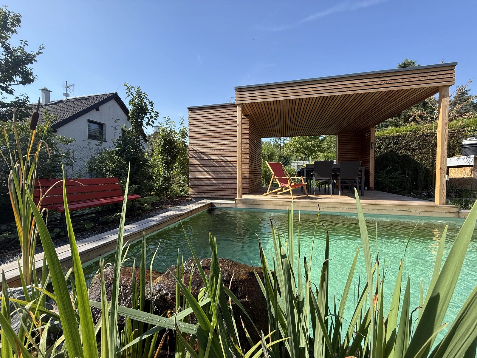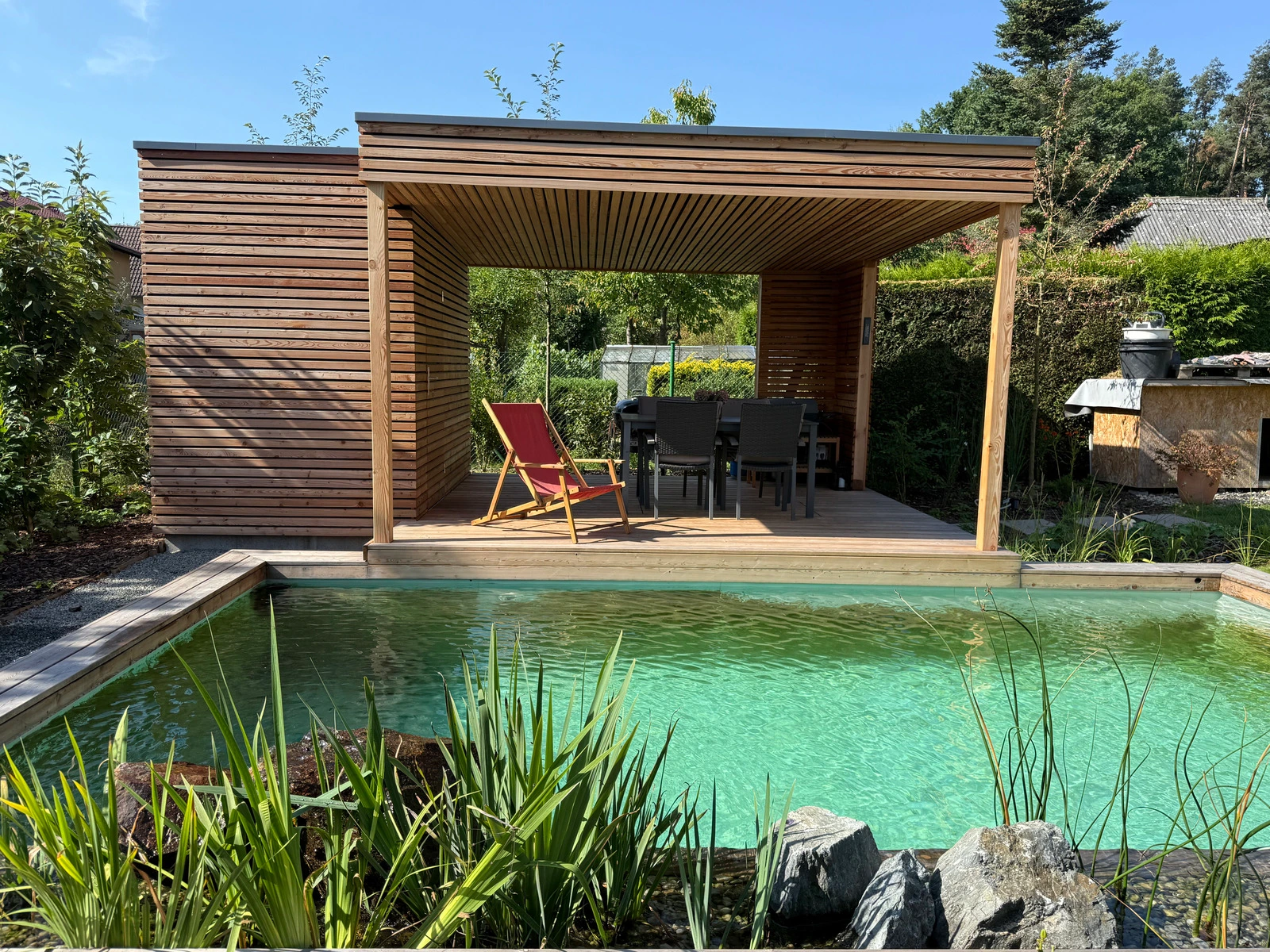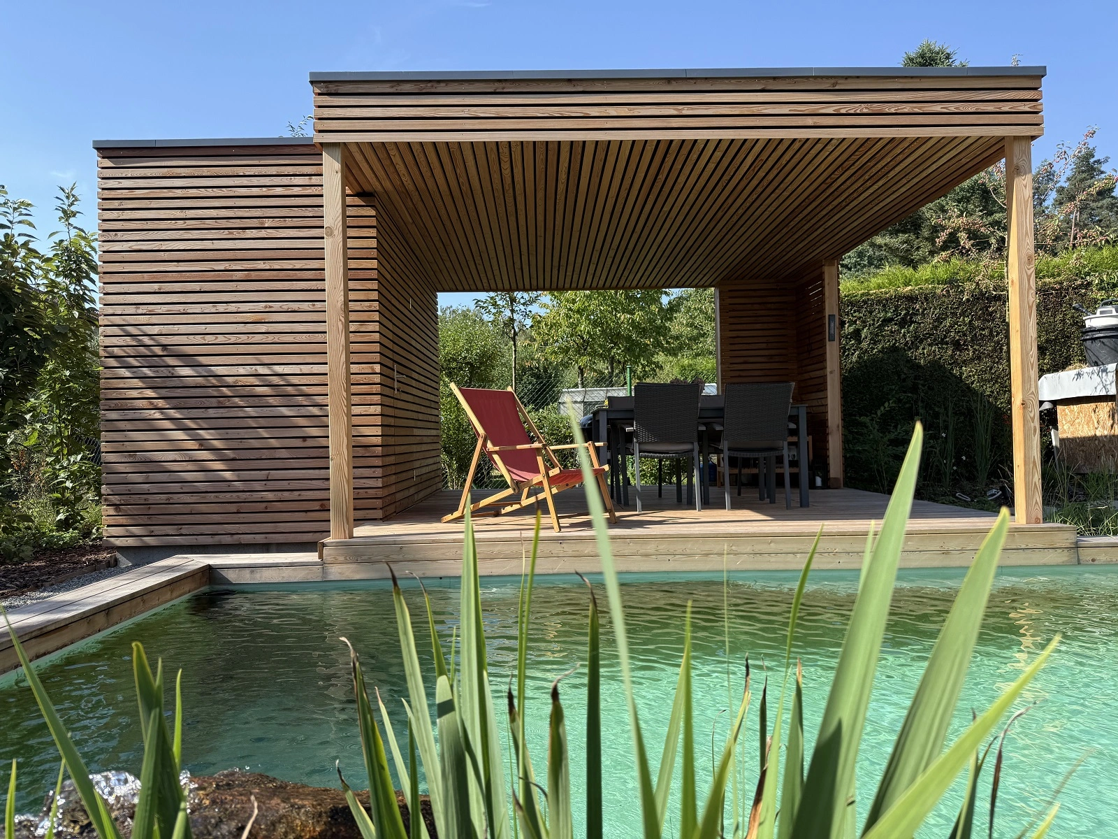 Výsledkom je multifunkčná záhradná stavba, ktorá rozširuje obytný priestor smerom do záhrady. Krytá terasa sa stáva prirodzeným centrom letného života – miestom na posedenie, oddych po kúpaní aj spoločné večery.
