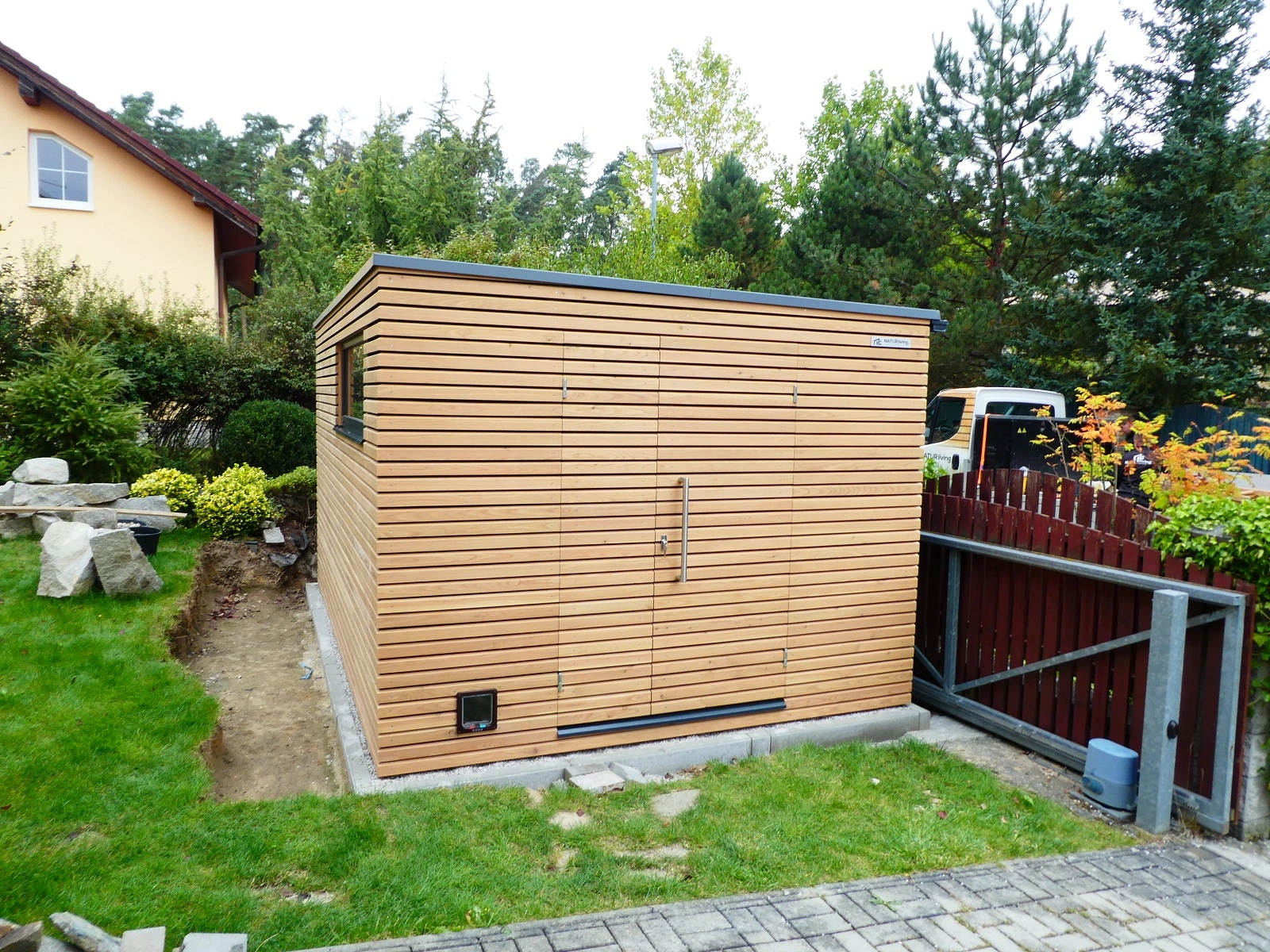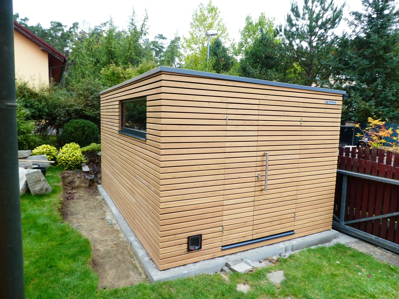 Pre túto realizáciu sme navrhli konštrukciu zatepleného záhradného domčeka NATURLIVING®, ktorá umožňuje stabilné a dlhodobé využívanie stavby. Fasáda je riešená kombinovaným obkladom z drevených latí a plechových fasádnych dosiek, čo vytvára moderný kontrast prírodného materiálu a technického prvku. Táto kombinácia zároveň zvyšuje odolnosť fasády a dodáva domčeku výrazný architektonický charakter.