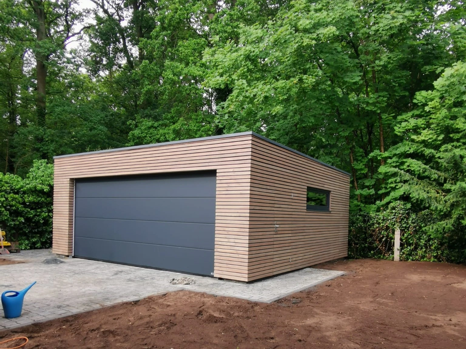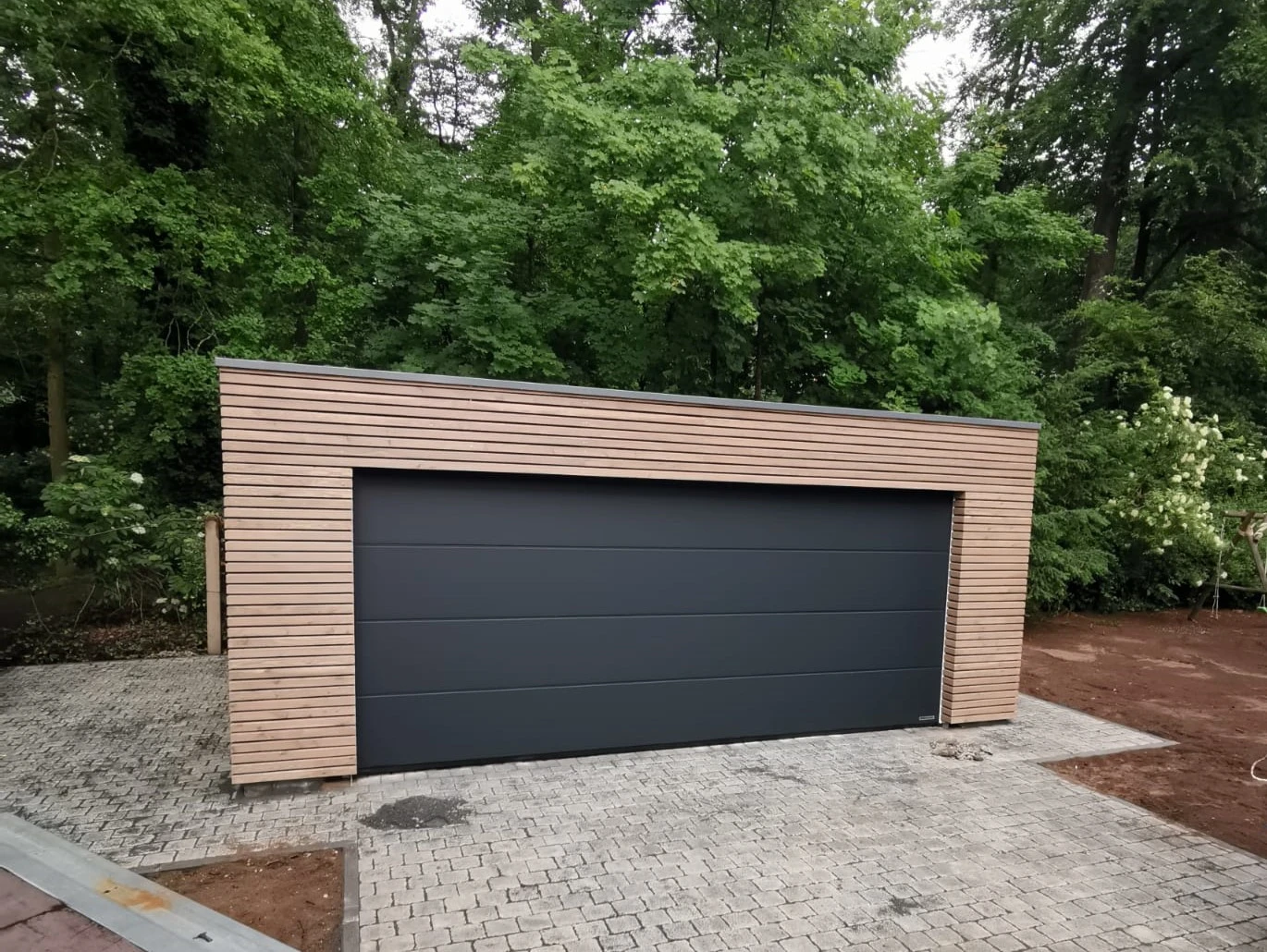 Navrhli a zrealizovali sme drevenú dvojgaráž so spoločnými bránami, ktoré umožňujú pohodlný vjazd aj manipuláciu. Konštrukcia bola prispôsobená tak, aby vo vnútri vznikol plnohodnotný priestor pre dve autá bez obmedzenia.