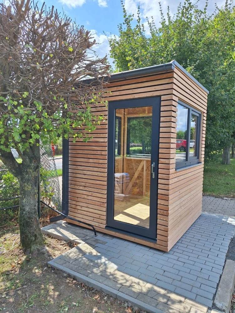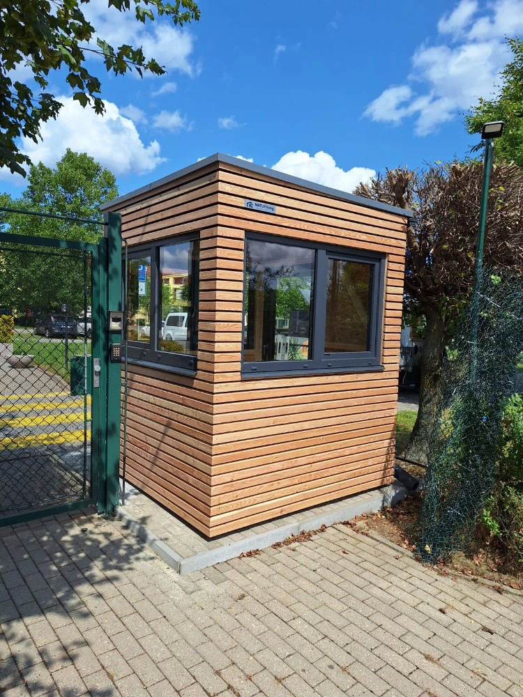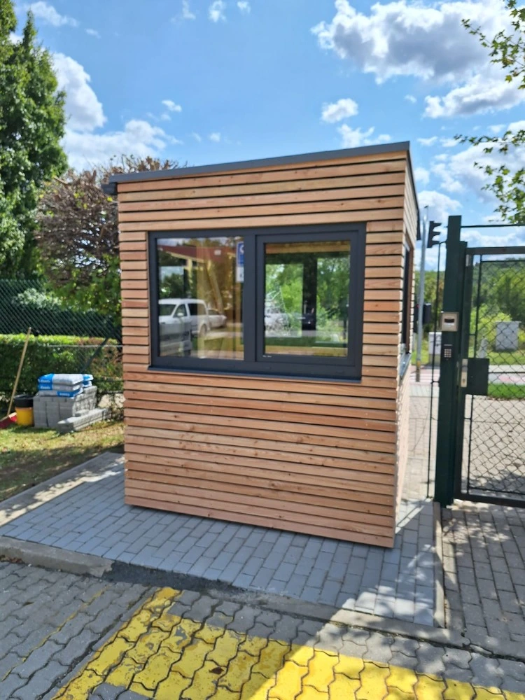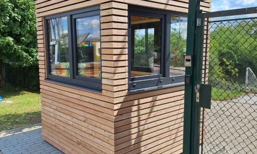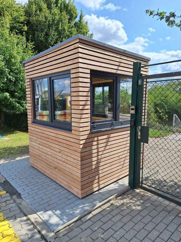 Moderná drevená strážnica s veľkými oknami pre maximálny prehľad