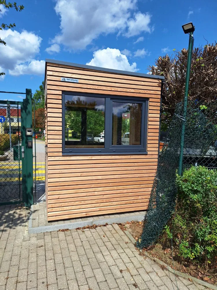 Navrhli sme kompaktnú drevenú budovu s väčším množstvom okien umiestnených zo všetkých strán, aby mal pracovník vrátnice maximálny prehľad o okolitom priestore. Vďaka tomu je možné pohodlne kontrolovať príjazd aj pohyb v blízkosti objektu bez nutnosti opúšťať vnútorný priestor.