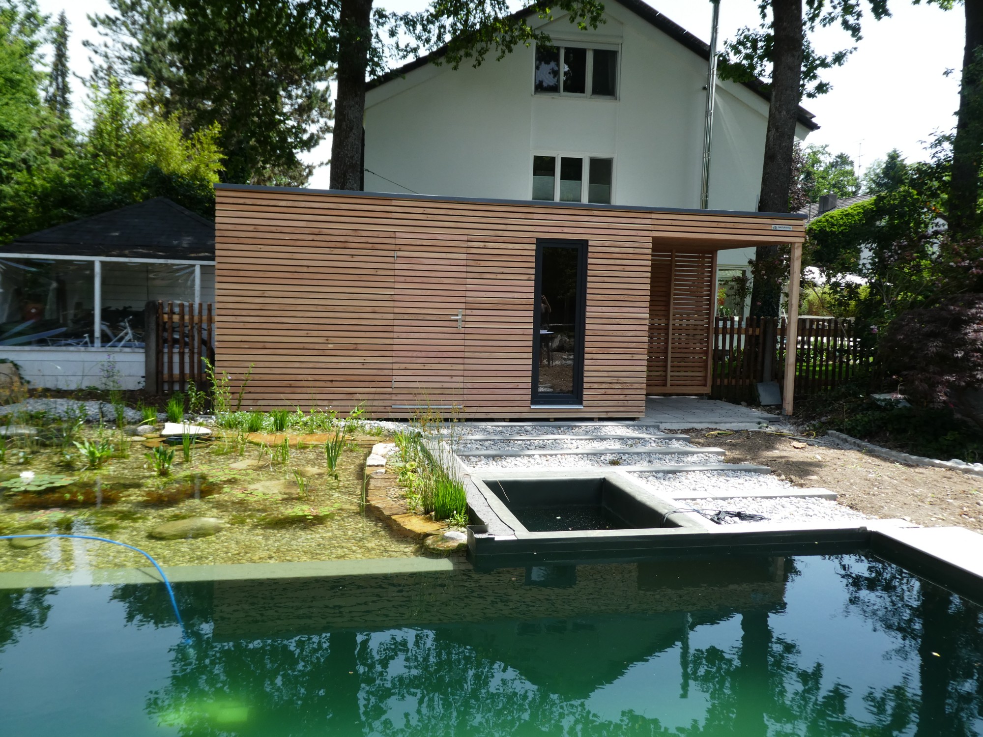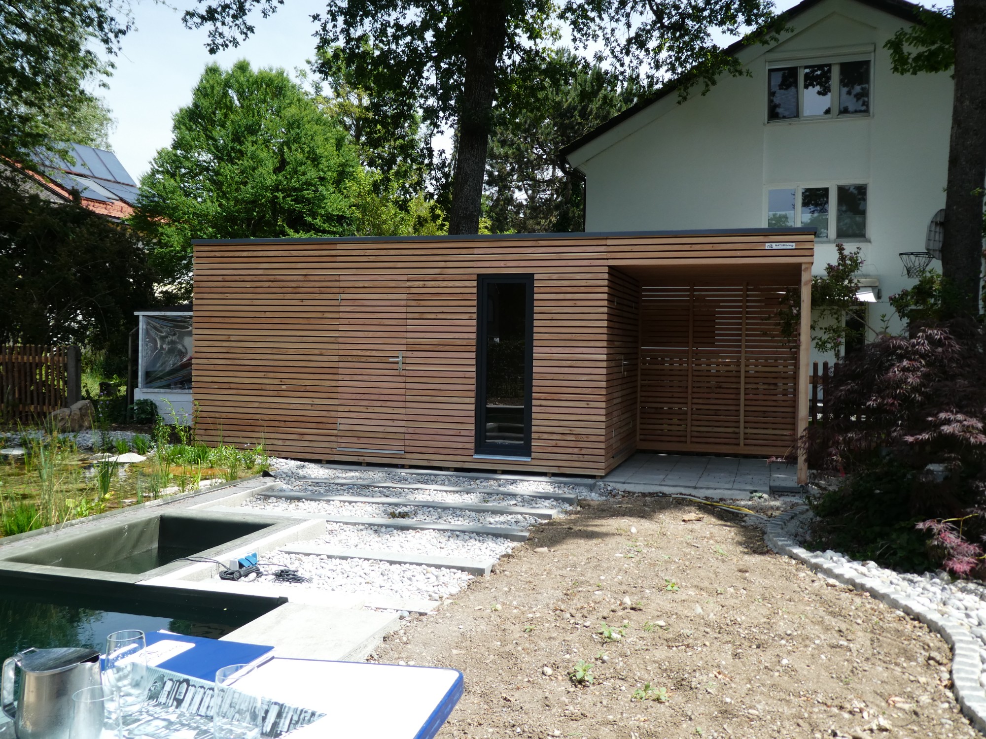 Bola navrhnutá stavba s rozmermi 2,5 × 2,5 m, ktorá efektívne kombinuje saunovú časť a záhradný domček. Konštrukcia je riešená s dôrazom na dlhú životnosť, stabilitu a minimálne nároky na údržbu. Použité materiály zodpovedajú štandardom NATURLIVING® a zabezpečujú príjemné mikroklíma tak v saune, ako aj v úložnej časti.