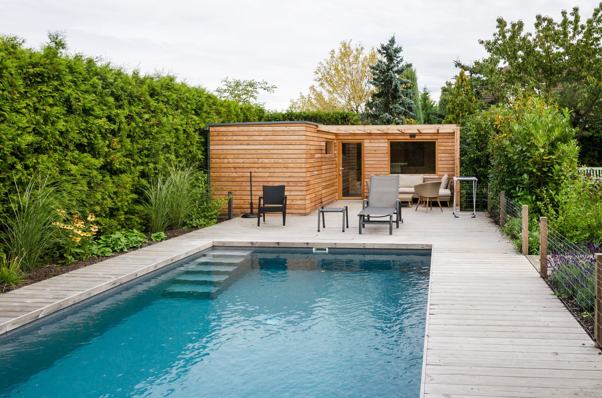 Riešením sa stala atypická stavba na mieru, ktorá rešpektuje polohu bazéna aj charakter záhrady. Sauna a záhradný domček sú spojené do jedného harmonického celku, ktorý pôsobí prirodzene a zároveň funkčne.