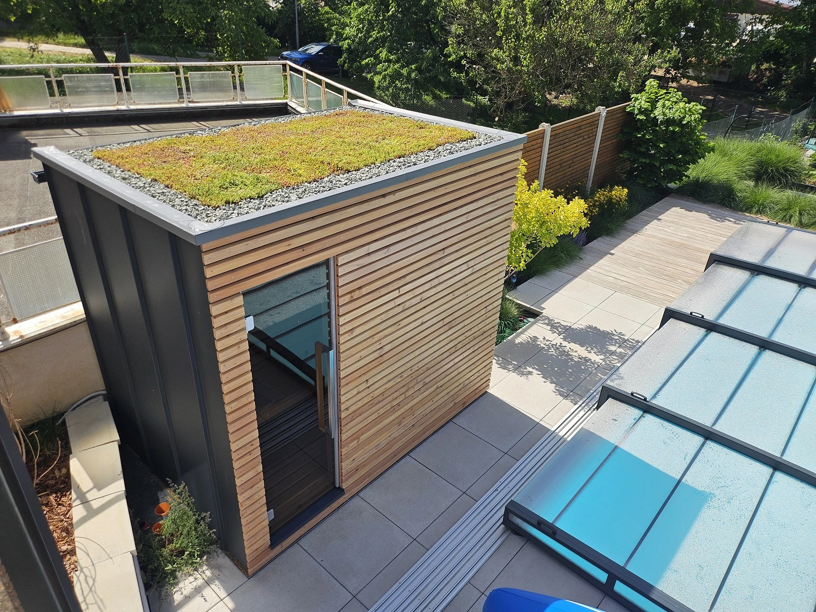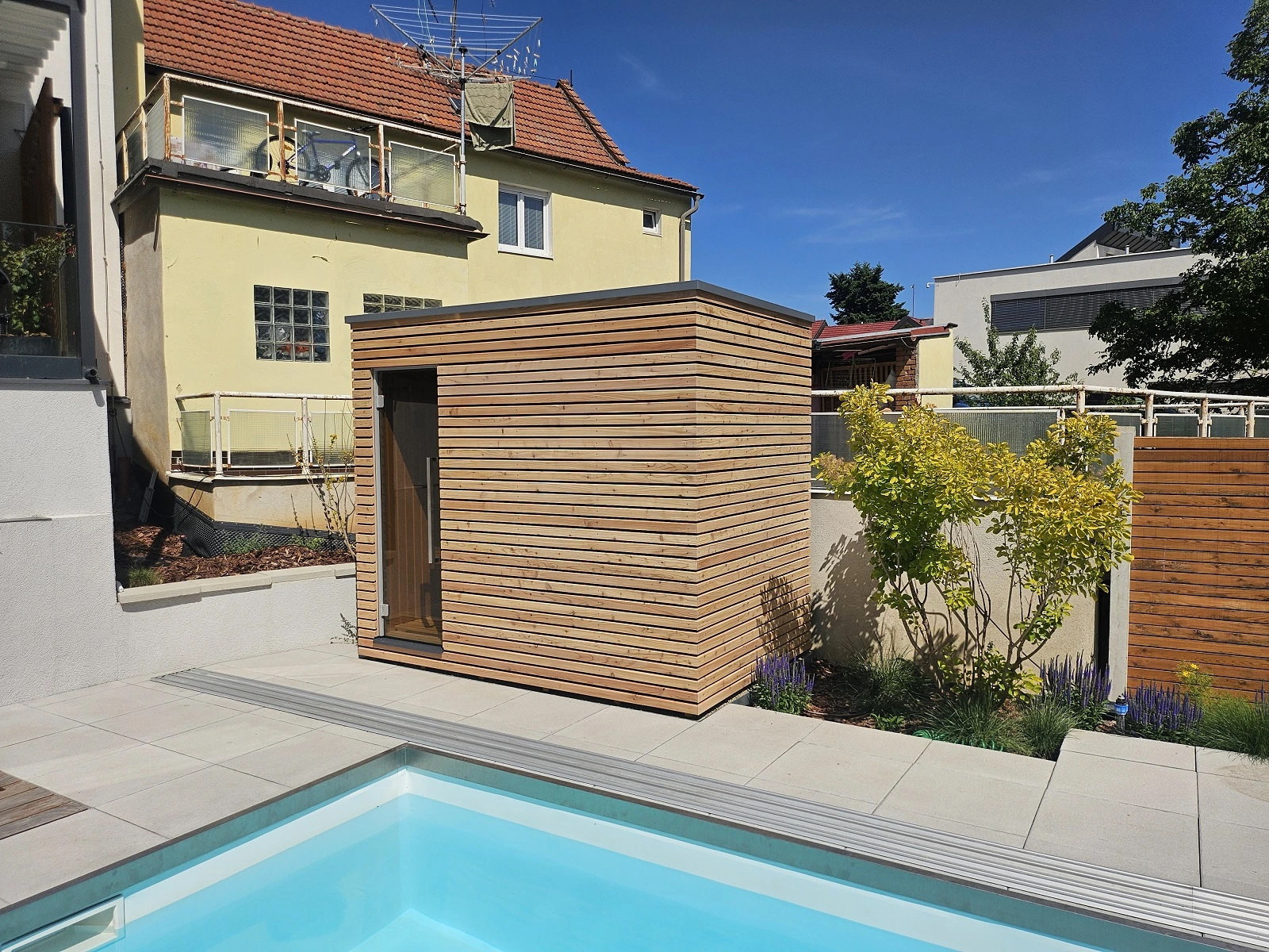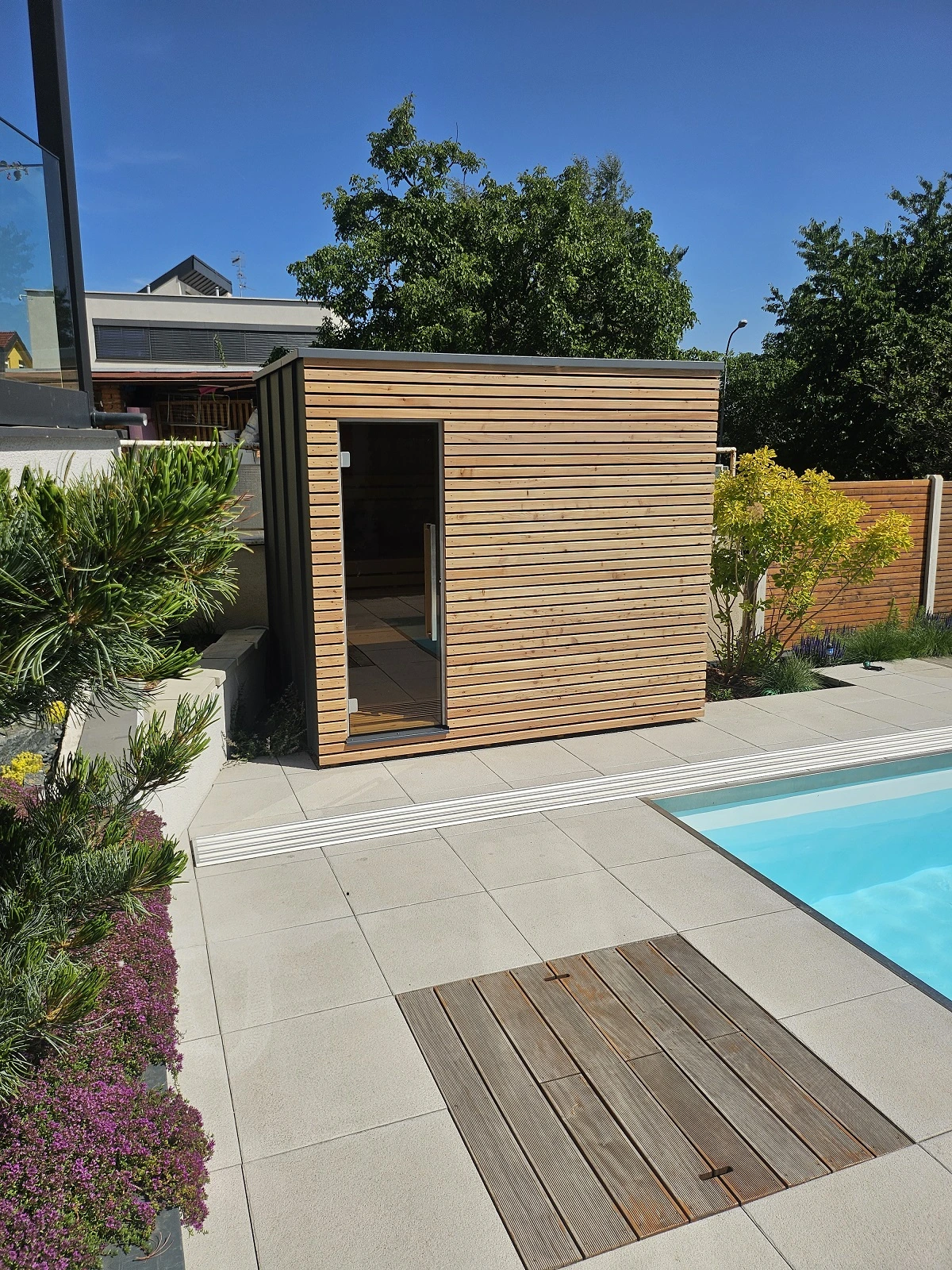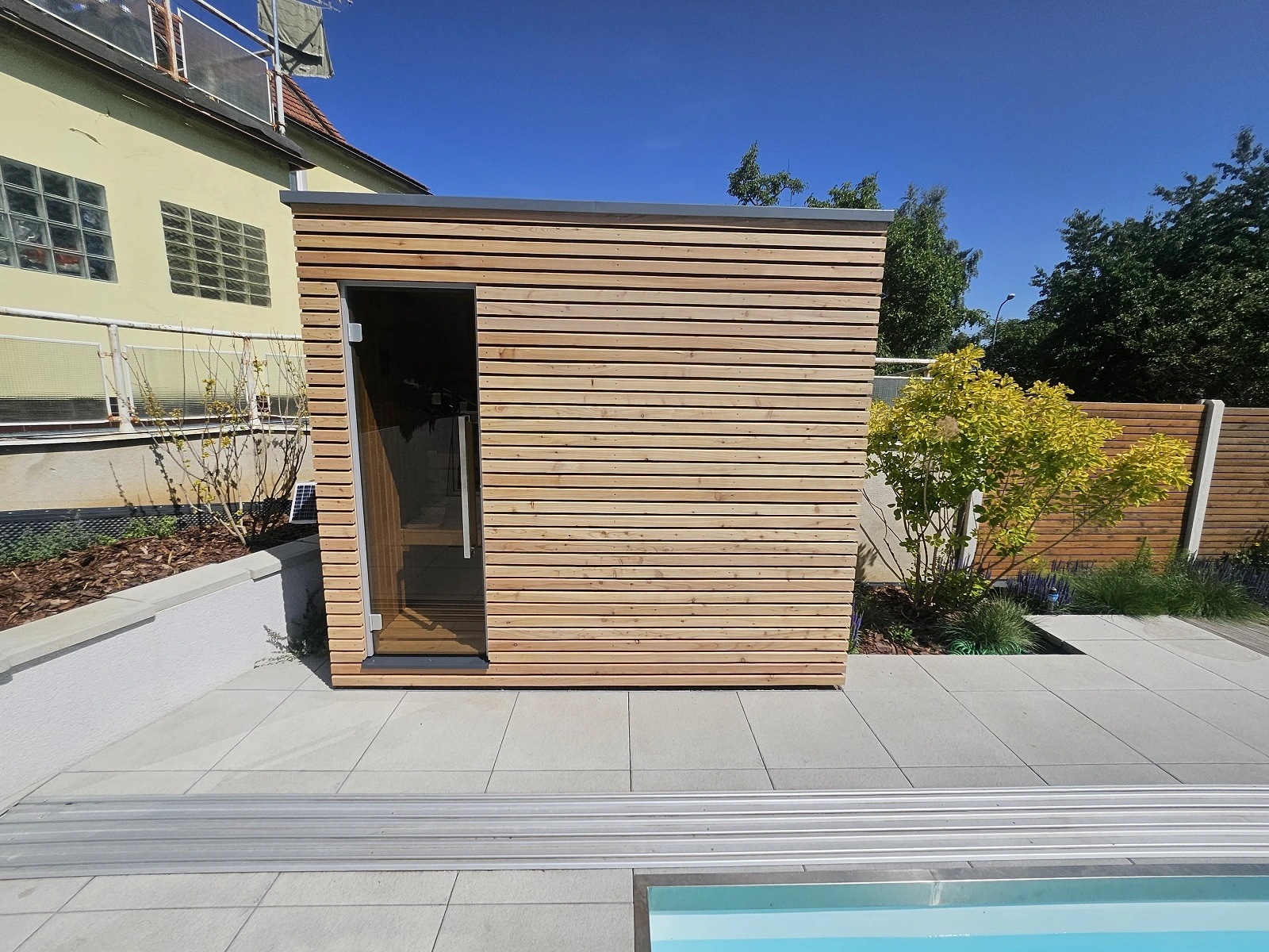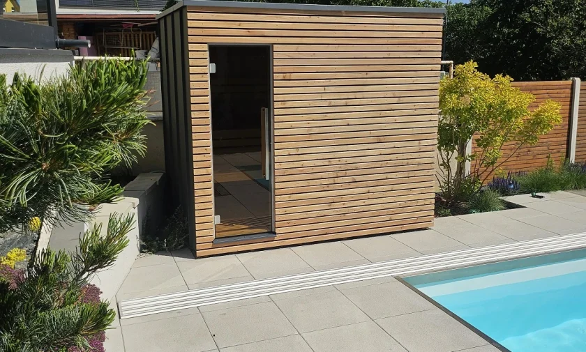 Vonkajšia sauna pri bazéne v jednotnom štýle záhrady