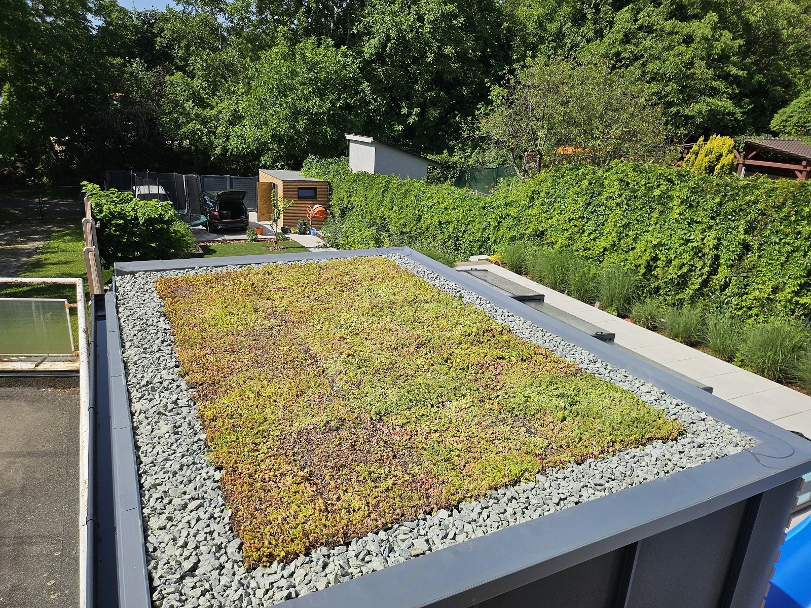 • je príjemná na pohľad aj z domu – majitelia majú z okien domu priamy výhľad na strechu sauny, vďaka zelenej streche tak nevidí technickú konštrukciu, ale prirodzenú súčasť záhrady