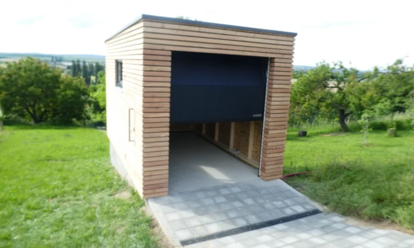 Výsledkom je kompaktná garáž, ktorá ponúka dostatok priestoru na uloženie záhradného traktora aj ďalšej techniky, a pritom rešpektuje obmedzený priestor na pozemku. Záhrada zostala vzdušná a prehľadná a klient získal funkčné riešenie presne podľa svojich potrieb.