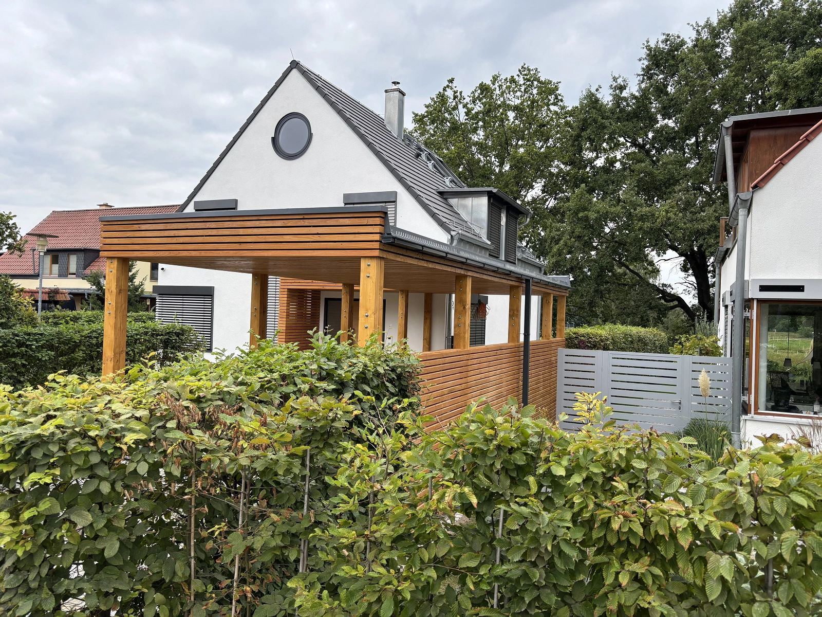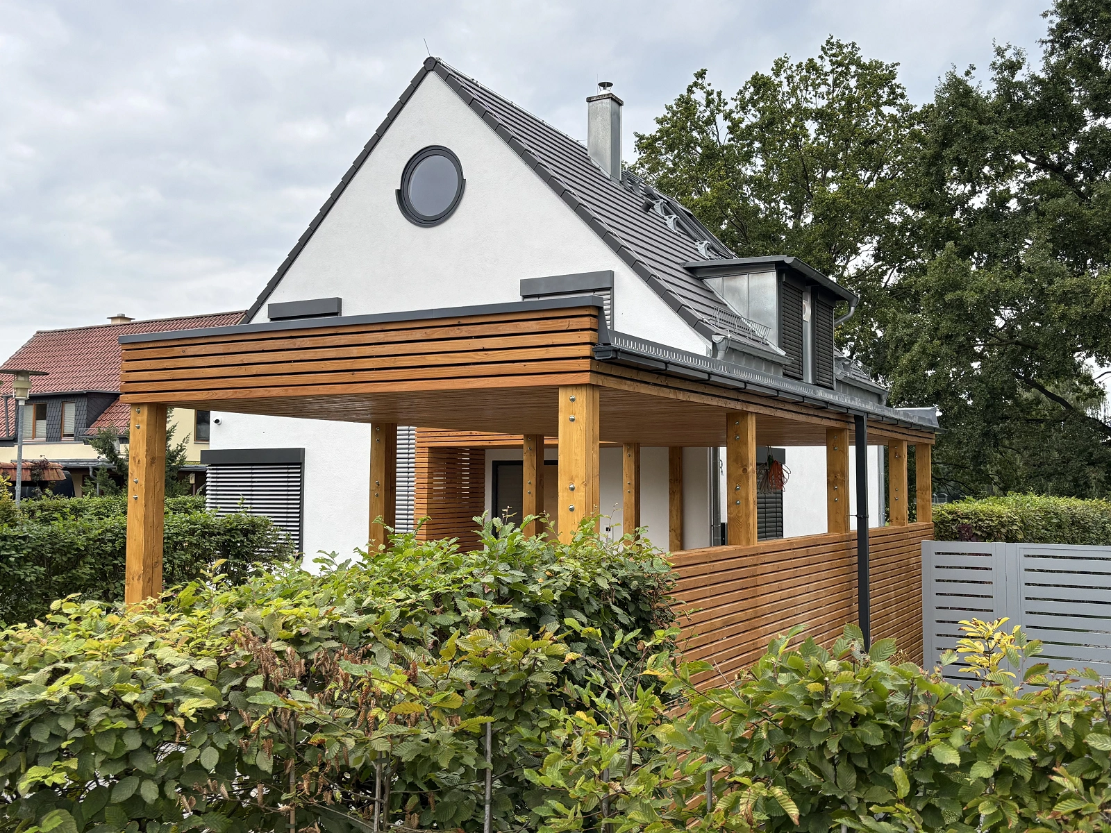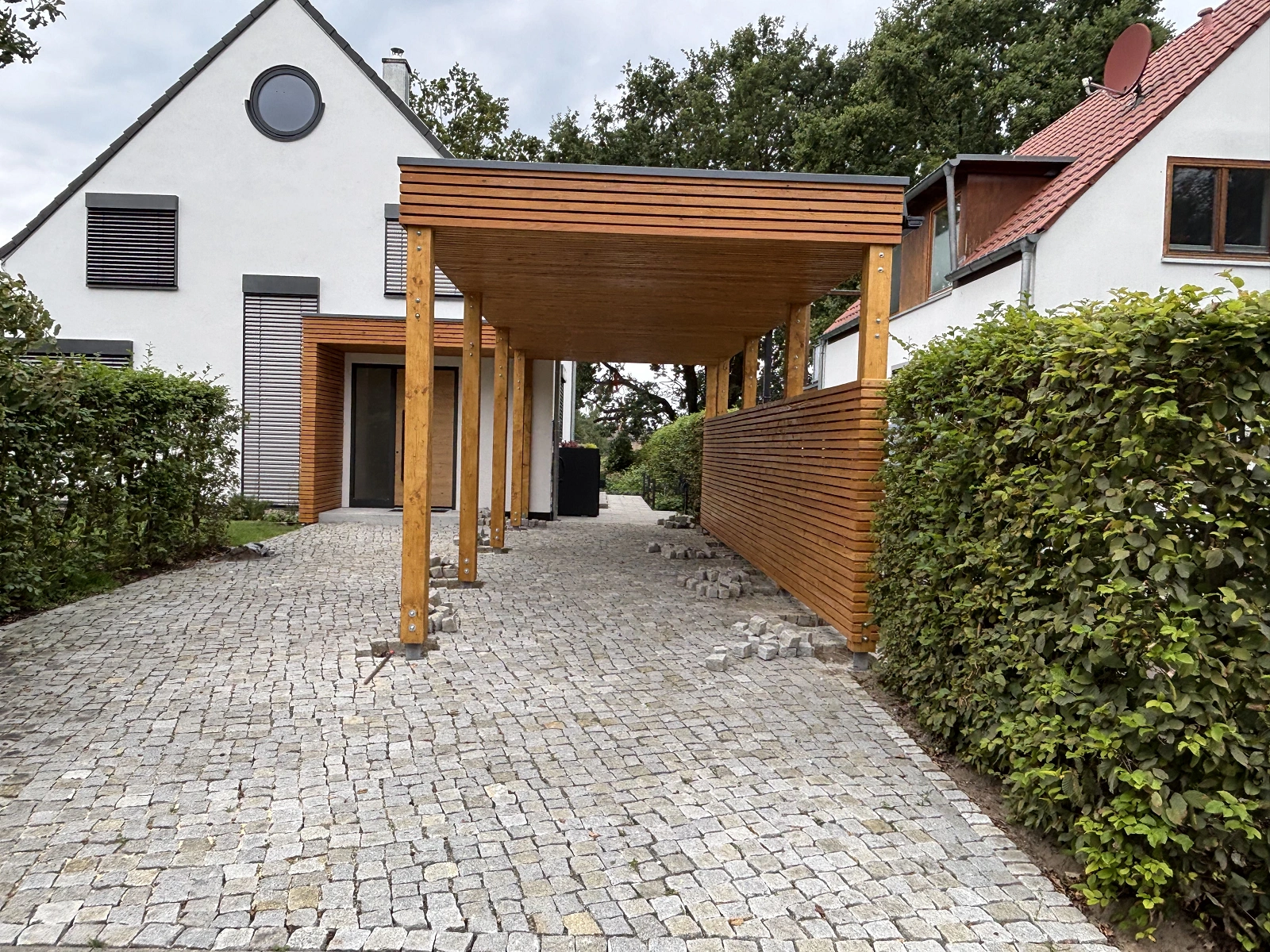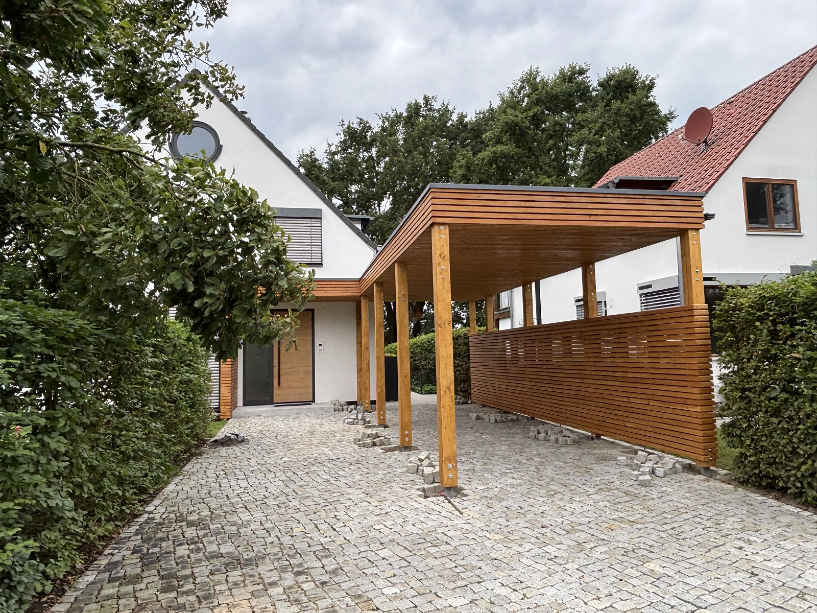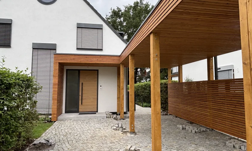 V blízkosti Berlína sme realizovali moderný prístrešok pre jedno auto, ktorý je funkčne aj architektonicky prepojený so zastrešením vchodu do domu. Cieľom bolo vytvoriť jednotný prvok, ktorý ochráni nielen auto, ale aj samotný vchod do objektu – a to v čistom, nadčasovom prevedení zodpovedajúcom súčasnej architektúre rodinného domu.