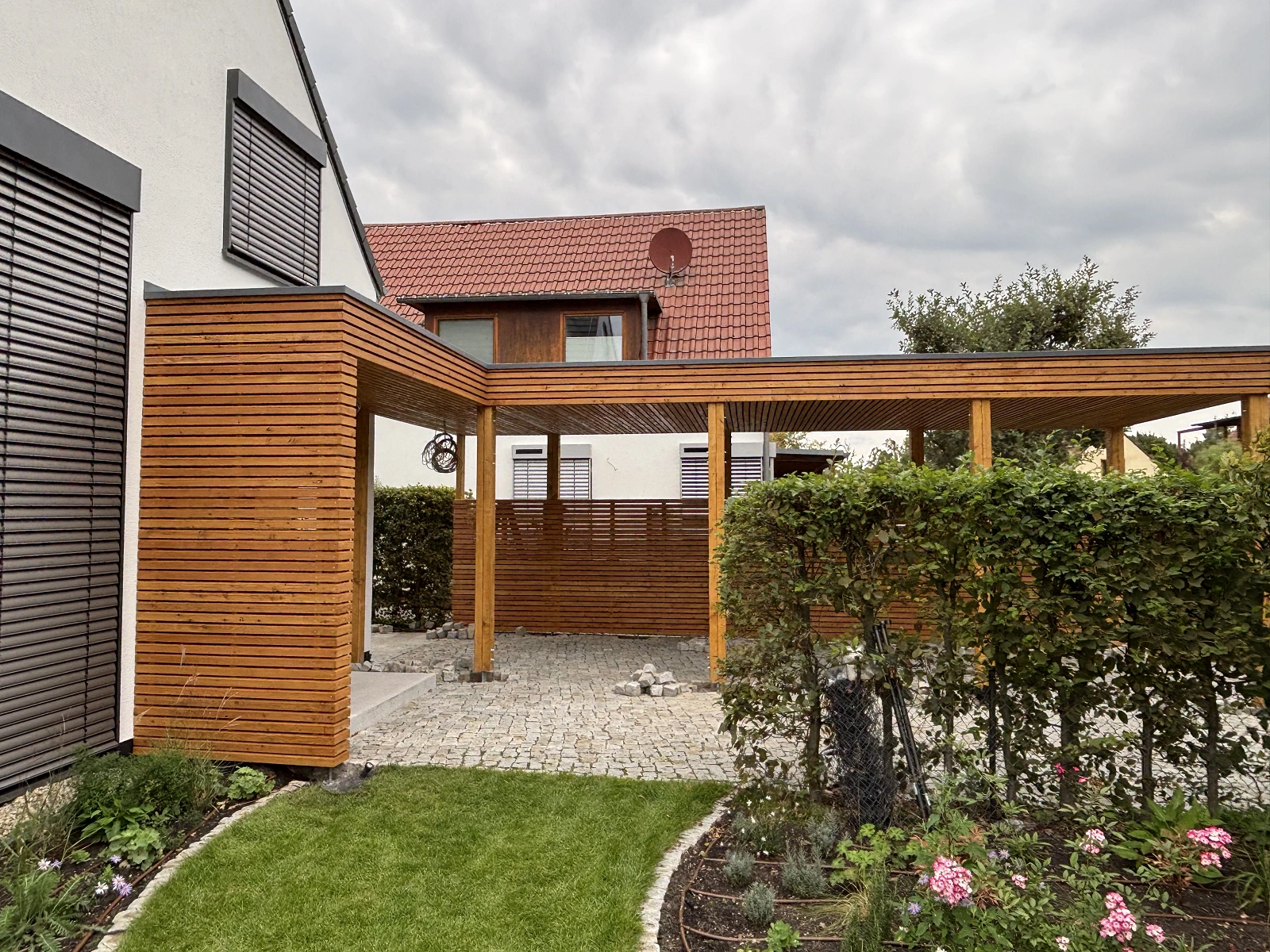 Dôraz bol kladený nielen na ochranu vozidla, ale aj na komfort pri každodennom používaní domu – najmä suchý a krytý prechod medzi autom a vchodovými dverami.
