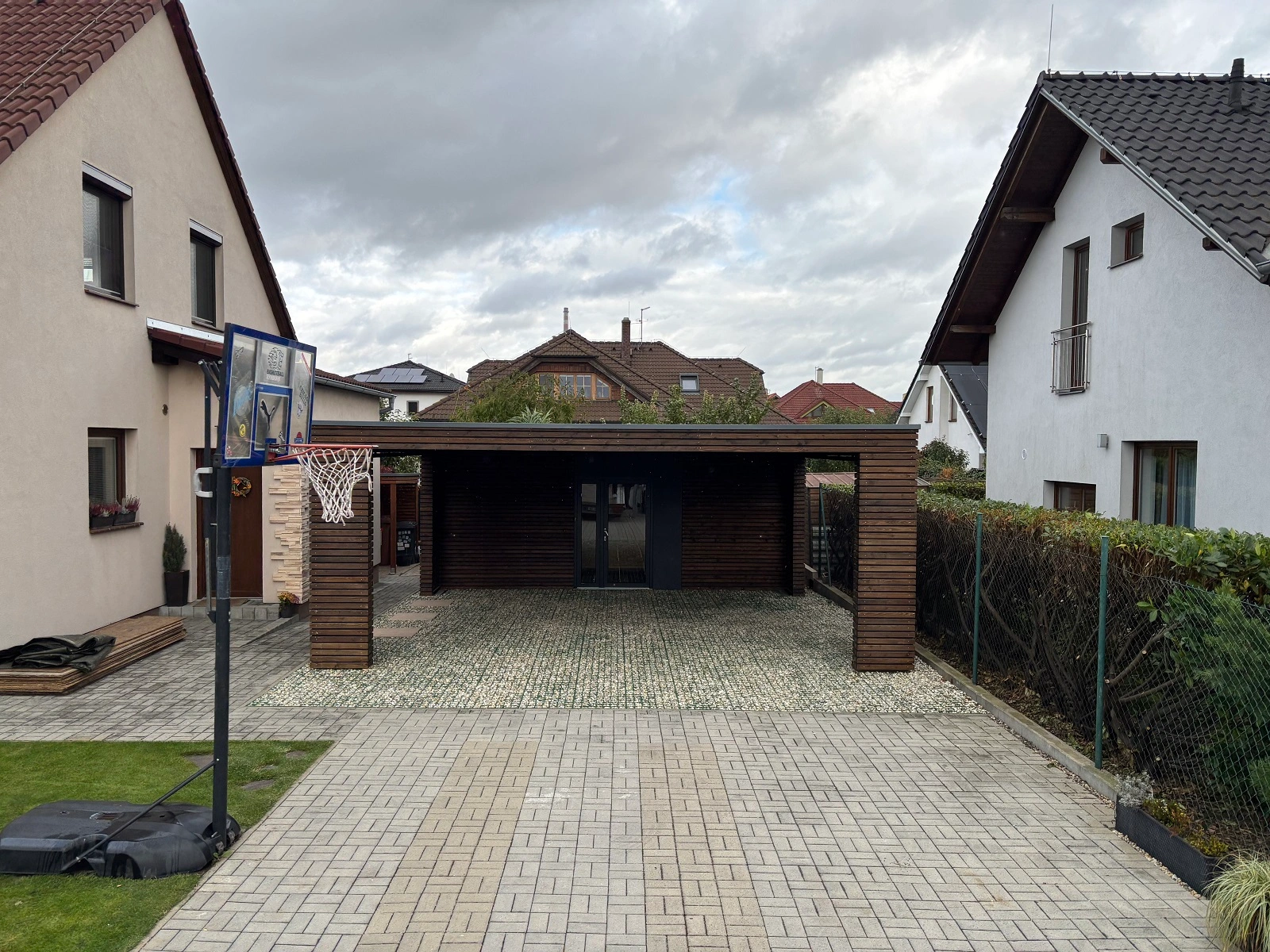 Tento projekt v Prahe vznikol ako praktické a zároveň estetické riešenie parkovania pre dve autá. Klient hľadal moderný prístrešok, ktorý by prirodzene zapadol k rodinnému domu a ponúkol viac než len zastrešenie – dôležitou súčasťou mal byť aj úložný a odkladací priestor.